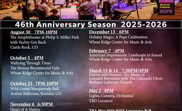 Denver Pops Orchestra is a community-based nonprofit organization that has been serving up great music in metro Denver for over 40 years. The 65+ members who volunteer their time and talents represent a variety of ages and vocations. The ensemble aims to serve Denver area communities through performances of familiar music, including a wide range of music from light classical and symphonic to operatic movements, Broadway and movie tunes to dance band and pops compositions. The Denver Pops perform regularly from August through May, offering a variety of concerts, formal dances, benefits, and special events.