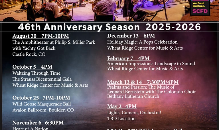 From the majesty of the Rockies to the sun-soaked deserts of the Southwest, the Denver Pops Orchestra invites you on a musical journey across America’s wide-open landscapes. Experience the sweeping grandeur of Jerry Brubaker’s Rocky Mountain Majesty, the rustic charm of Leroy Anderson’s Horse and Buggy and Chicken Reel, and the vibrant colors of Mary Mixter’s contemporary tone poem Southwest Impressions.